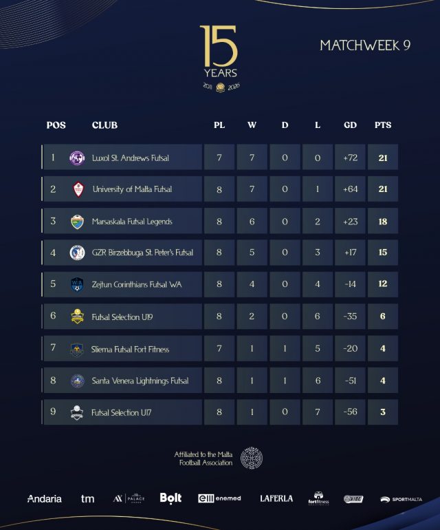 Elsewhere, Malta FA Futsal Selection U17 celebrated their first victory of the season, winning 5–3 against Santa Venera Lightnings Futsal. The University of Malta also maintained pressure at the top after their 3–0 triumph over Sliema Futsal Fort Fitness.